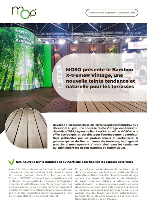 Industriels 20 décembre 2023 - 15:48 Dévoilée à l’occasion du salon Paysalia, qui s’est tenu du 5 au 7 décembre à Lyon, une nouvelle teinte Vintage vient enrichir, dès début 2024, la gamme Bamboo X-treme de MOSO, une offre écologique et durable pour l’aménagement extérieur. PDF (621 Ko) Télécharger