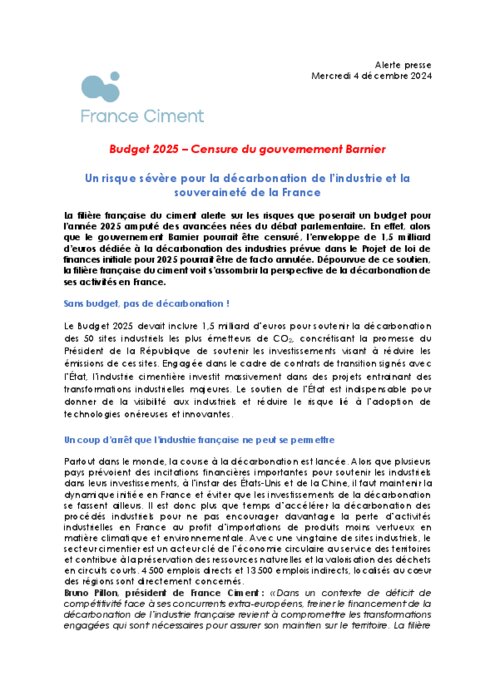 La filière française du ciment alerte sur les risques que poserait un budget pour l’année 2025 amputé des avancées nées du débat parlementaire. En effet, alors que le gouvernement Barnier pourrait être censuré, l’enveloppe de 1,5 milliard d’euros dédiée à la décarbonation des industries prévue dans le Projet de loi de finances initiale pour 2025 pourrait être de facto annulée. Dépourvue de ce soutien, la filière française du ciment voit s’assombrir la perspective de la décarbonation de ses activités en France.