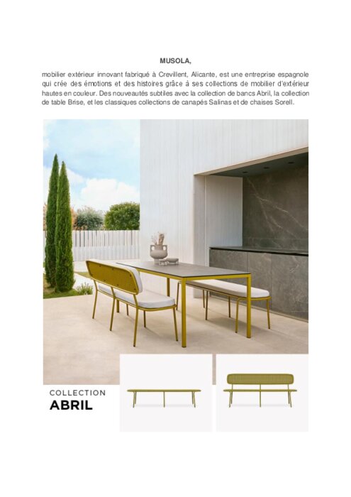 MUSOLA, mobilier extérieur innovant fabriqué à Crevillent, Alicante, est une entreprise espagnole qui crée des émotions et des histoires grâce à ses collections de mobilier d’extérieur hautes en couleur. Des nouveautés subtiles avec la collection de bancs Abril, la collection de table Brise, et les classiques collections de canapés Salinas et de chaises Sorell.