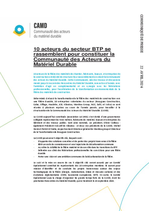 Déterminés à réussir la transformation de la filière des matériels de construction vers une filière durable, 10 entreprises volontaires du secteur (Bouygues Construction, Colas, Eiffage, Haulotte, JCB, Kiloutou, Manitou Group, NGE, Salti, et Volvo) se sont réunies à plusieurs reprises au cours de l’année passée, pour travailler à la structuration de la Communauté des Acteurs du Matériel Durable (CAMD).