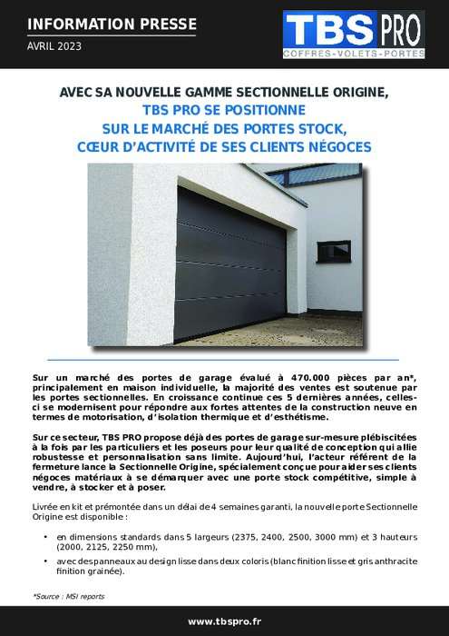 Industriels 17 avril 2023 - 08:34 Aujourd’hui, l’acteur référent de la fermeture lance la Sectionnelle Origine, spécialement conçue pour aider ses clients négoces matériaux à se démarquer avec une porte stock compétitive, simple à vendre, à stocker et à poser. PDF (698 Ko) Télécharger