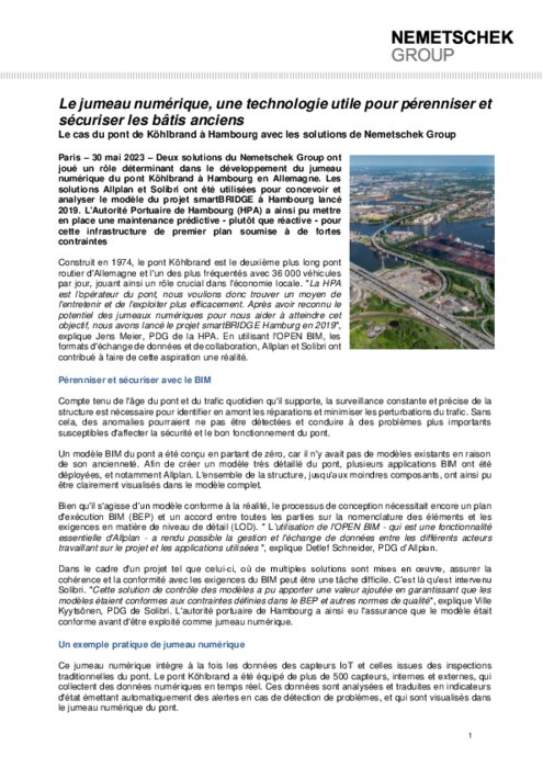 Deux solutions du Nemetschek Group ont joué un rôle déterminant dans le développement du jumeau numérique du pont Köhlbrand à Hambourg en Allemagne. Les solutions Allplan et Solibri ont été utilisées pour concevoir et analyser le modèle du projet smartBRIDGE à Hambourg lancé 2019. L'Autorité Portuaire de Hambourg (HPA) a ainsi pu mettre en place une maintenance prédictive - plutôt que réactive - pour cette infrastructure de premier plan soumise à de fortes contraintes.