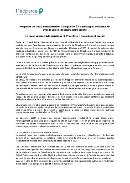 Neoparcel, expert conseil indépendant en immobilier foncier, annonce sa contribution pour faire évoluer tout un quartier de la ville de Strasbourg. Ce projet, annoncé fin mars aux citoyens de Strasbourg par l’équipe municipale, débutera en 2026. Il permet de valoriser cinq hectares industriels et voit évoluer le PLU de l’Eurométropole de Strasbourg.