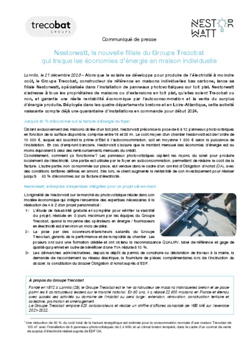 Alors que le solaire se développe pour produire de l’électricité à moindre coût, le Groupe Trecobat, constructeur de référence en maisons individuelles bas carbone, lance sa filiale Nestorwatt, spécialisée dans l’installation de panneaux photovoltaïques sur toit plat.