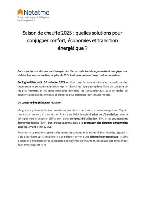 Face à la hausse des prix de l’énergie, les thermostats Netatmo permettent aux foyers de réduire leur consommation de plus de 20 % tout en améliorant leur confort quotidien.