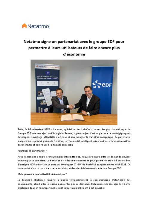 Netatmo, spécialiste des solutions connectées pour la maison, et le Groupe EDF, acteur majeur de l’énergie en France, signent aujourd'hui un partenariat stratégique pour développer davantage la flexibilité électrique et accompagner la transition énergétique. Ce partenariat s’appuie sur le produit phare de Netatmo, le Thermostat Intelligent, afin d’optimiser la consommation des ménages et contribuer à la stabilité du réseau.