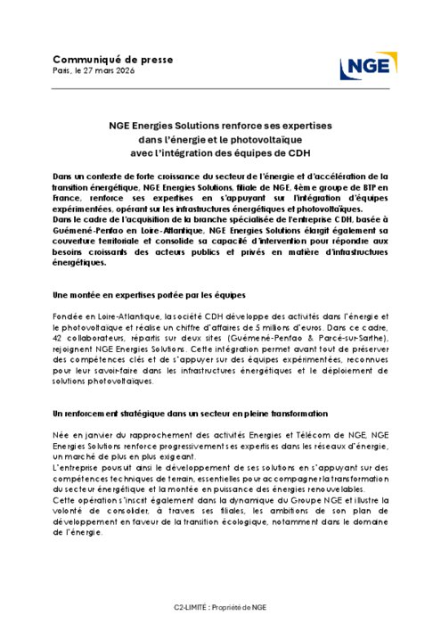 NGE Energies Solutions annonce l’intégration des équipes de CDH, spécialisée dans les infrastructures énergétiques et photovoltaïques. Avec cette opération, la filiale de NGE renforce ses expertises techniques dans un secteur en forte croissance, tout en élargissant son maillage territorial dans l’Ouest. 42 collaborateurs rejoignent ainsi l’entreprise, avec un savoir-faire reconnu dans le déploiement de solutions photovoltaïques .