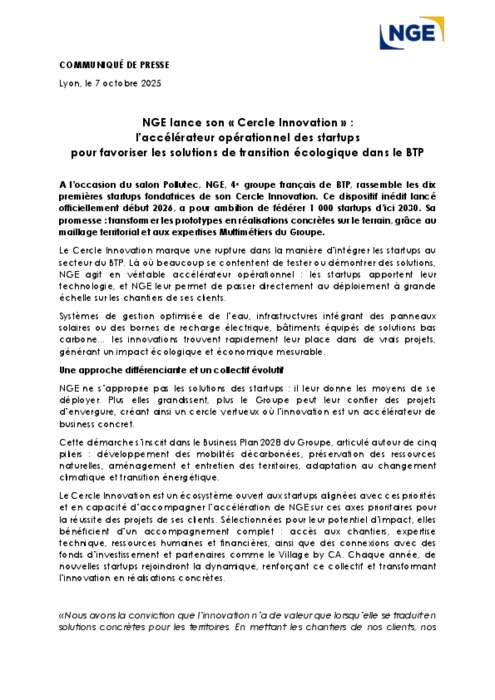 À l’occasion du salon Pollutec, NGE, 4ᵉ groupe français de BTP, rassemble les dix premières startups fondatrices de son Cercle Innovation. Ce dispositif inédit lancé officiellement début 2026, a pour ambition de fédérer 1 000 startups d’ici 2030. Sa promesse : transformer les prototypes en réalisations concrètes sur le terrain, grâce au maillage territorial et aux expertises Multimétiers du Groupe.