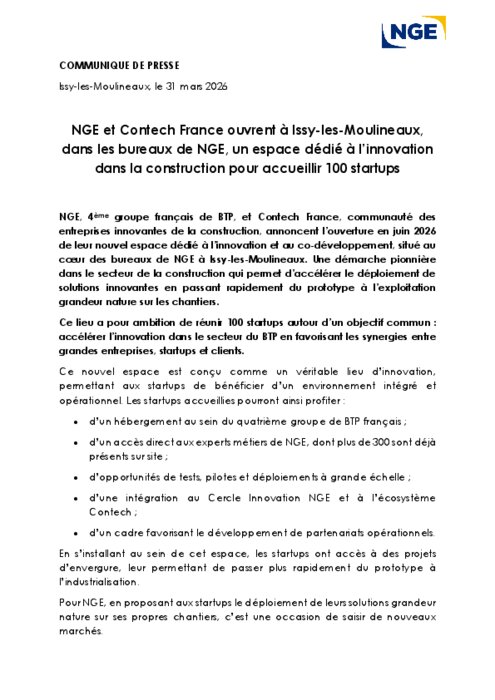 Industriels 08 avril 2026 - 10:19 NGE et Contech France annoncent l’ouverture, en juin à Issy-les-Moulineaux, d’un espace dédié à l’innovation dans la construction, capable d’accueillir jusqu’à 100 startups. PDF (99 Ko) Télécharger nge