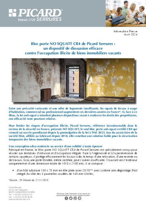 Pour limiter les risques d’occupation illicite, Picard Serrures, référence incontournable dans le secteur de la sécurité en France, présente NO SQUATT, le seul bloc porte anti-squat certifié CR4 qui connaît un succès grandissant depuis la promulgation de la loi à l’été 2023. Issu du savoir-faire de la société Eliot, affiliée au fabricant depuis 2018, elle constitue une solution fiable pour la sécurisation temporaire des biens immobiliers vacants.