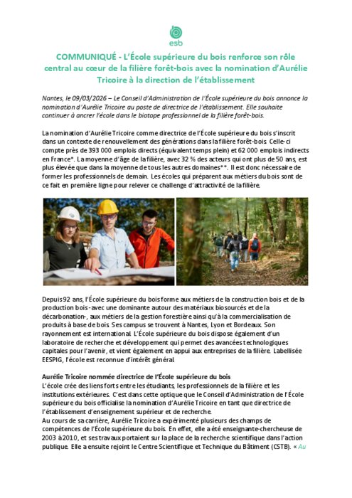 La nomination d’Aurélie Tricoire comme directrice de l’École supérieure du bois s’inscrit dans un contexte de renouvellement des générations dans la filière forêt-bois. Celle-ci compte près de 393 000 emplois directs (équivalent temps plein) et 62 000 emplois indirects en France. La moyenne d’âge de la filière, avec 32 % des acteurs qui ont plus de 50 ans, est plus élevée que dans la moyenne de tous les autres domaines. Il est donc nécessaire de former les professionnels de demain. Les écoles qui préparent aux métiers du bois sont de ce fait en première ligne pour relever ce challenge d’attractivité de la filière.