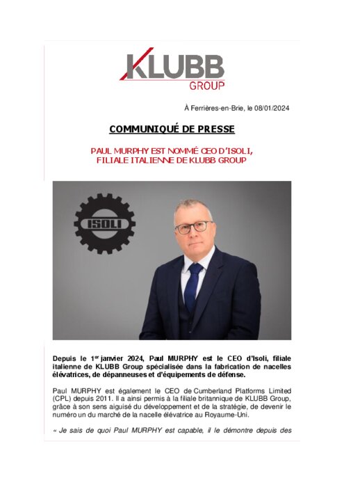 Industriels 08 janvier 2024 - 10:30 Depuis le 1er janvier 2024, Paul MURPHY est le CEO d’Isoli, filiale italienne de KLUBB Group spécialisée dans la fabrication de nacelles élévatrices, de dépanneuses et d’équipements de défense. PDF (199 Ko) Télécharger