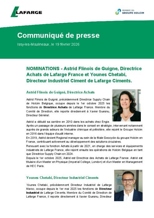 Astrid Flinois de Guigné, précédemment directrice Supply Chain de Holcim Belgique, occupe depuis le 1er octobre 2025 les fonctions de directrice Achats de Lafarge France. Membre du Comité de direction, elle reporte directement à Xavier Guesnu, directeur général. Younes Chetabi, précédemment directeur industriel de Lafarge Maroc, occupe depuis le 1er mai 2025 les fonctions de directeur industriel de Lafarge Ciments. Membre du Comité de direction de Lafarge France, il reporte également directement à Xavier Guesnu. Il remplace Christophe Riout, qui endosse les responsabilités de directeur de la Transformation industrielle Ciment, toujours membre du Comité de direction de Lafarge France et directement rattaché Xavier Guesnu.