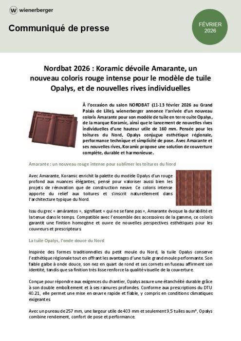 À l’occasion du salon NORDBAT (11-13 février 2026 au Grand Palais de Lille), wienerberger annonce l’arrivée d’un nouveau coloris Amarante pour son modèle de tuile en terre cuite Opalys, de la marque Koramic, ainsi que le lancement de nouvelles rives individuelles d’une hauteur utile de 160 mm. Pensée pour les toitures du Nord, Opalys conjugue esthétique régionale, performance technique et simplicité de pose. Avec Amarante et ses nouvelles rives, Koramic propose une solution de couverture complète, durable et harmonieuse.