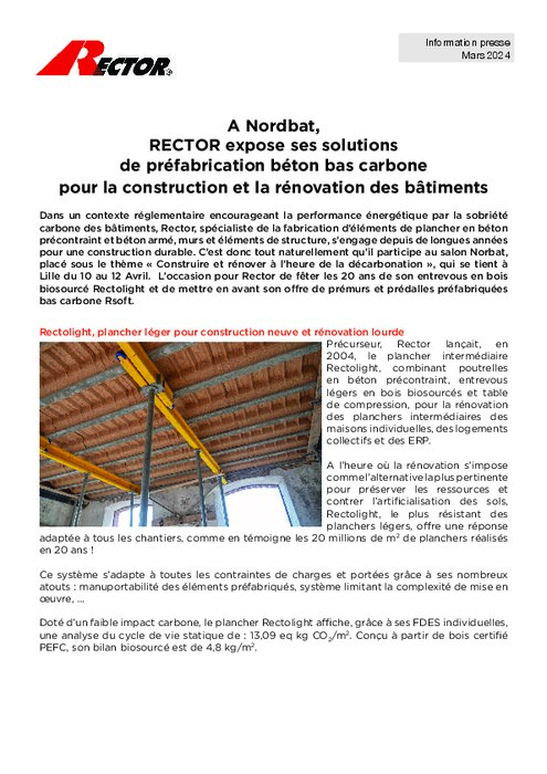 Dans un contexte réglementaire encourageant la performance énergétique par la sobriété carbone des bâtiments, Rector, spécialiste de la fabrication d’éléments de plancher en béton précontraint et béton armé, murs et éléments de structure, s’engage depuis de longues années pour une construction durable. C’est donc tout naturellement qu’il participe au salon Norbat.