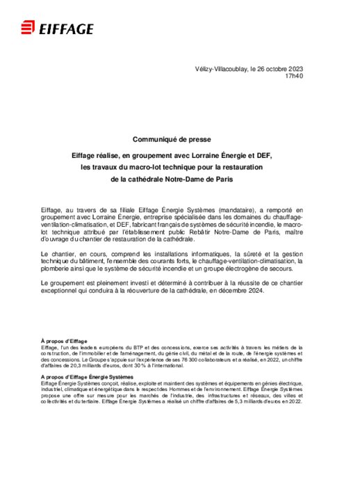 Eiffage, au travers de sa filiale Eiffage Énergie Systèmes (mandataire), a remporté en groupement avec Lorraine Énergie, entreprise spécialisée dans les domaines du chauffage-ventilation-climatisation, et DEF, fabricant français de systèmes de sécurité incendie, le macro-lot technique attribué par l’établissement public Rebâtir Notre-Dame de Paris, maître