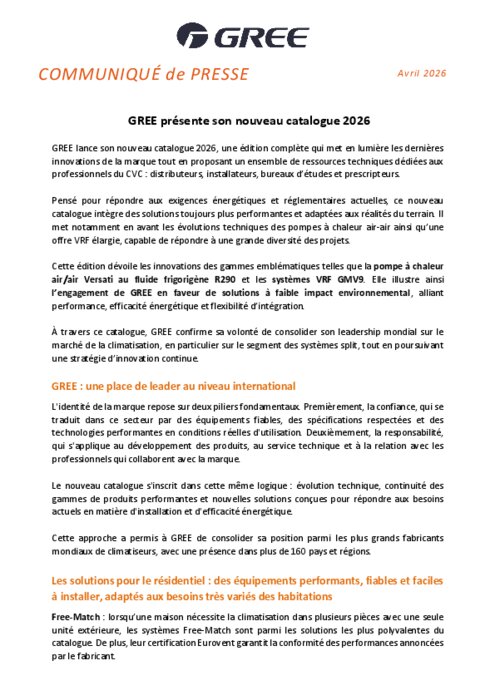 Gree lance son nouveau catalogue 2026, une édition complète qui met en lumière les dernières innovations de la marque tout en proposant un ensemble de ressources techniques dédiées aux professionnels du CVC : distributeurs, installateurs, bureaux d’études et prescripteurs.