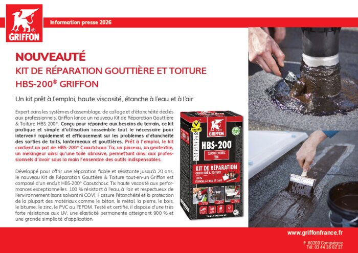 Expert dans les systèmes d'assemblage, de collage et d'étanchéité dédiés aux professionnels, Griffon lance un nouveau Kit de Réparation Gouttière & Toiture HBS-200®. Conçu pour répondre aux besoins du terrain, ce kit pratique et simple d'utilisation rassemble tout le nécessaire pour intervenir rapidement et efficacement sur les problèmes d'étanchéité des sorties de toits, lanterneaux et gouttières. Prêt à l'emploi, le kit contient un pot de HBS-200® Caoutchouc Tix, un pinceau, un géotextile, un mélangeur ainsi qu'une toile abrasive, permettant ainsi aux professionnels d'avoir sous la main l'ensemble des outils indispensables.