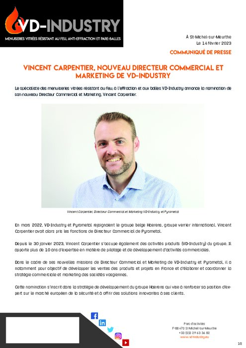 Industriels 14 février 2023 - 13:17 Le spécialiste des menuiseries vitrées résistant au feu, à l’effraction et aux balles VD-Industry annonce la nomination de son nouveau Directeur Commercial et Marketing, Vincent Carpentier. PDF (984 Ko) Télécharger