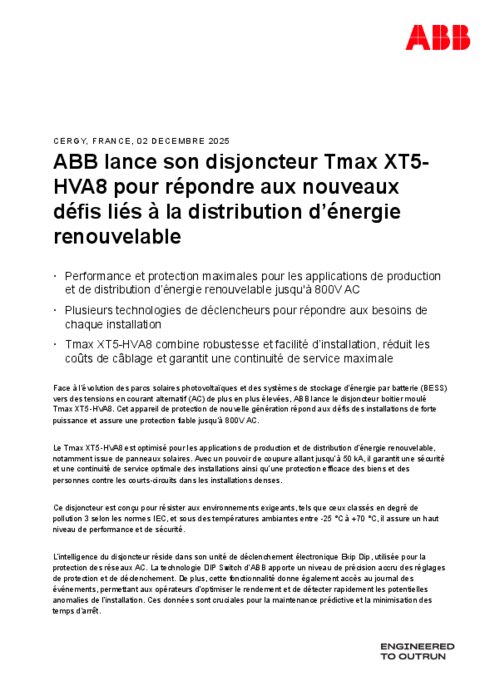 Face à l'évolution des parcs solaires photovoltaïques et des systèmes de stockage d'énergie par batterie (BESS) vers des tensions en courant alternatif (AC) de plus en plus élevées, ABB lance le disjoncteur boîtier moulé Tmax XT5-HVA8. Cet appareil de protection de nouvelle génération répond aux défis des installations de forte puissance et assure une protection fiable jusqu'à 800V AC.