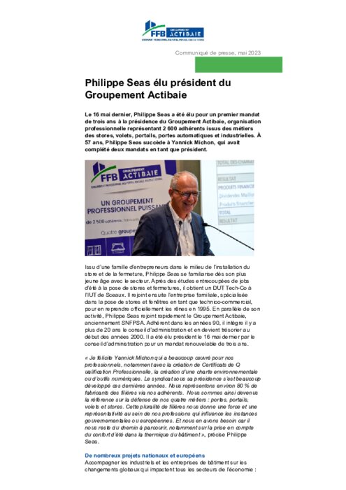 Le 16 mai dernier, Philippe Seas a été élu pour un premier mandat de trois ans à la présidence du Groupement Actibaie, organisation professionnelle représentant 2 600 adhérents issus des métiers des stores, volets, portails, portes automatiques et industrielles. À 57 ans, Philippe Seas succède à Yannick Michon, qui avait complété deux mandats en tant que président.