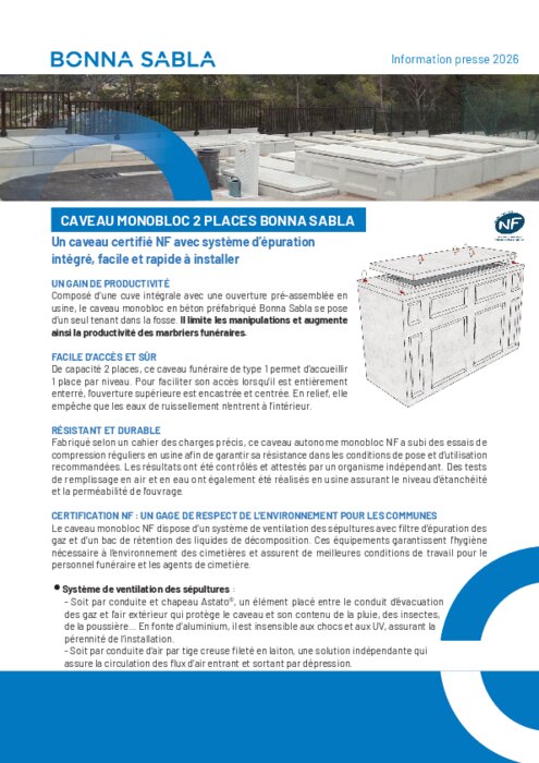Composé d’une cuve intégrale avec une ouverture pré-assemblée en usine, le caveau monobloc en béton préfabriqué Bonna Sabla se pose d’un seul tenant dans la fosse. Il limite les manipulations et augmente ainsi la productivité des marbriers funéraires.