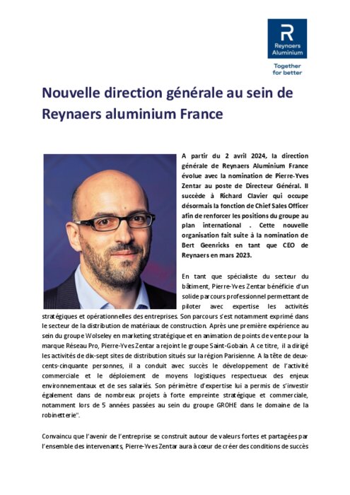 Zentar au poste de Directeur Général. Il succède à Richard Clavier qui occupe désormais la fonction de Chief Sales Officer afin de renforcer les positions du groupe au plan international . Cette nouvelle organisation fait suite à la nomination de Bert Geenricks en tant que CEO de Reynaers en mars 2023.