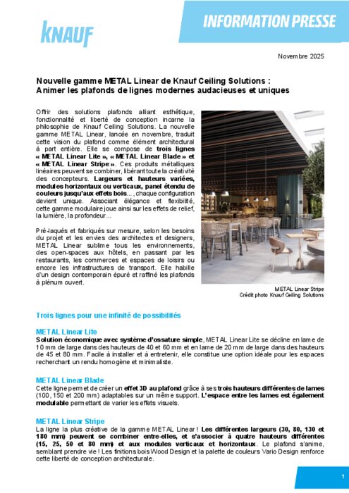 Nouvelle gamme METAL Linear de Knauf Ceiling Solutions