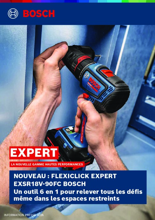 Dans la nouvelle gamme hautes performances expert, Bosch lance un nouvel outil 6 en 1, à la fois compact et puissant, capable de visser, percer et perforer : la perceuse-visseuse sans-fil expert EXSR18V-90FC. Grâce au système Flexiclick et ses différents adaptateurs facilement interchangeables, menuisiers, cuisinistes, agenceurs, plombiers ont entre leurs mains un seul outil qui leur permet de réaliser une multitude de travaux courants dans différents matériaux. Puissance, flexibilité optimale et confort accru caractérisent la nouvelle EXSR18V-90FC.