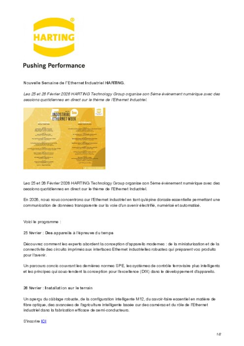 Les 25 et 26 février 2026, HARTING Technology Group organise son 5e événement numérique avec des sessions quotidiennes en direct sur le thème de l’Ethernet industriel. En 2026, nous nous concentrons sur l'Ethernet industriel en tant qu'épine dorsale essentielle permettant une communication de données transparente sur la voie d'un avenir électrifié, numérisé et automatisé.
