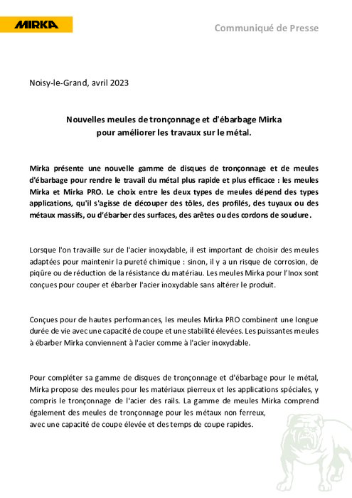 Mirka présente une nouvelle gamme de disques de tronçonnage et de meules d'ébarbage pour rendre le travail du métal plus rapide et plus efficace : les meules Mirka et Mirka PRO. Le choix entre les deux types de meules dépend des types applications, qu'il s'agisse de découper des tôles, des profilés, des tuyaux ou des métaux massifs, ou d’ébarber des surfaces, des arêtes ou des cordons de soudure.