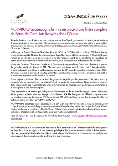 Recycler le béton dans le béton est une pratique encore inhabituelle, pour autant, la technique est prête, et la réglementation le rend possible. Une impulsion est nécessaire pour en faire une filière à part entière. Impulsion qui est donnée, en partie grâce à NOVABUILD, pour le projet expérimental et emblématique Le Carrousel, à Nantes.
