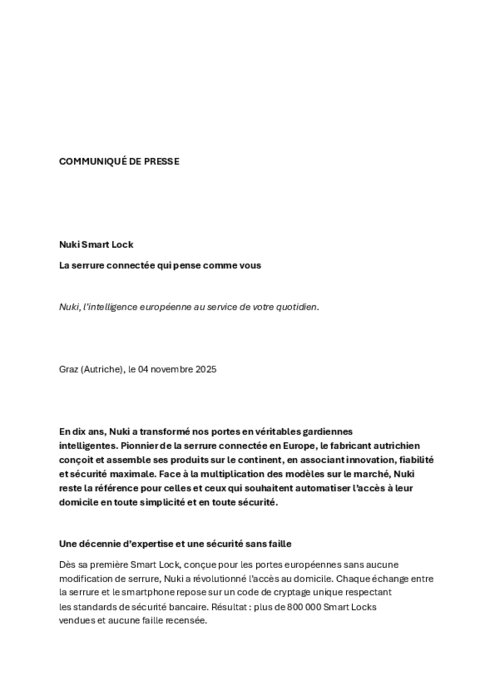 En dix ans, Nuki a transformé nos portes en véritables gardiennes intelligentes. Pionnier de la serrure connectée en Europe, le fabricant autrichien conçoit et assemble ses produits sur le continent, en associant innovation, fiabilité et sécurité maximale. Face à la multiplication des modèles sur le marché, Nuki reste la référence pour celles et ceux qui souhaitent automatiser l’accès à leur domicile en toute simplicité et en toute sécurité.