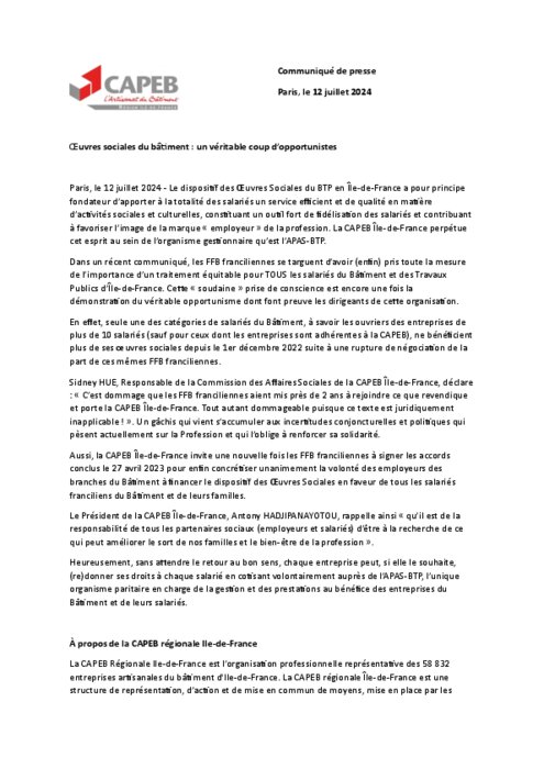Œuvres Sociales du BTP en Île-de-France : La CAPEB régionale exprime ses préoccupations