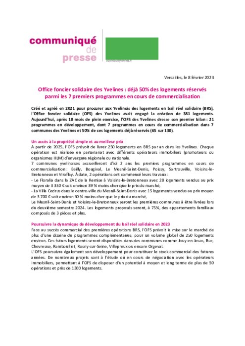 Créé et agréé en 2021 pour procurer aux Yvelinois des logements en bail réel solidaire (BRS), l'Office foncier solidaire (OFS) des Yvelines avait engagé la création de 381 logements. Aujourd’hui, après 18 mois de plein exercice, l’OFS des Yvelines dresse son premier bilan : 21 programmes en développement, dont 7 programmes en cours de commercialisation dans sept communes des Yvelines et 50 % de ces logements déjà réservés (65 sur 130).