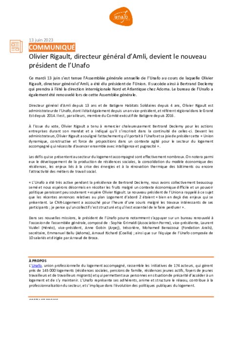 Ce mardi 13 juin s’est tenue l’Assemblée générale annuelle de l’Unafo au cours de laquelle Olivier Rigault, directeur général d’Amli, a été élu président de l’Union. Il succède ainsi à Bertrand Declemy qui prendra à l’été la direction interrégionale Nord et Atlantique chez Adoma. Le bureau de l’Unafo a également été renouvelé lors de cette Assemblée générale.
