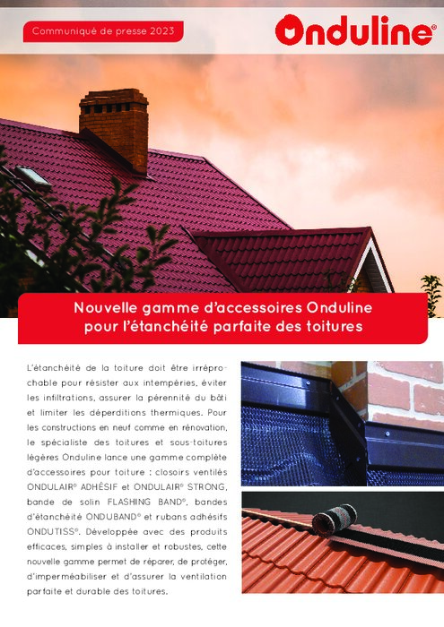 Le spécialiste des toitures et sous-toitures légères Onduline lance une gamme complète d’accessoires pour toiture : closoirs ventilés ONDULAIR ADHÉSIF et ONDULAIR STRONG, bande de solin FLASHING BAND, bandes d’étanchéité ONDUBAND et rubans adhésifs ONDUTISS. Développée avec des produits efficaces, simples à installer et robustes, cette nouvelle gamme permet de réparer, de protéger,