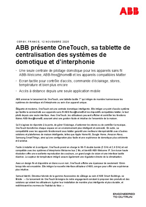 ABB annonce le lancement de OneTouch, une tablette tactile 7’’ qui intègre de manière harmonieuse les systèmes de domotique et d’interphonie au sein d’un appareil unique. Élégante et moderne, OneTouch est une centrale domotique intelligente. Elle intègre un point d’accès système qui facilite la connectivité aux appareils sans fil ABB-free@home et les dispositifs compatibles Matter, le tout piloté depuis une seule interface. Avec OneTouch, les utilisateurs peuvent afficher et contrôler les fonctions filaires ABB-free@home, assurant ainsi une gestion fluide et intuitive de l’ensemble de la maison.