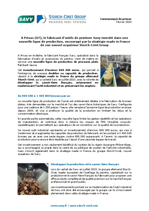 A Privas en Ardèche, le fabricant français Savy, spécialisé dans la fabrication d’outils et accessoires du peintre, vient de mettre en service une nouvelle ligne de production de pinceaux plats flambant neuve. Cet investissement d’environ 800 000 euros, qui permet à l’entreprise de presque doubler sa capacité de production, répond à la stratégie made in France du groupe allemand Storch-Ciret, qui a racheté Savy en juillet 2023, avec la volonté de développer le savoir-faire français, notamment en modernisant l’outil industriel et en préservant les emplois.