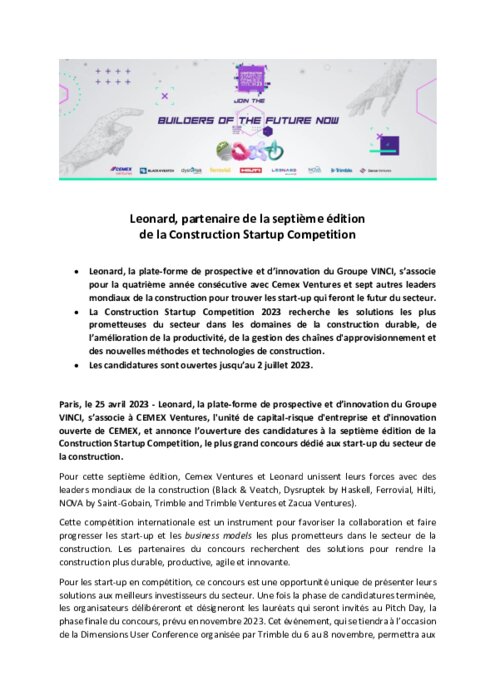 La Construction Startup Competition 2023 recherche les solutions les plus prometteuses du secteur dans les domaines de la construction durable, de l’amélioration de la productivité, de la gestion des chaînes d'approvisionnement et des nouvelles méthodes et technologies de construction. Les candidatures sont ouvertes jusqu’au 2 juillet 2023.