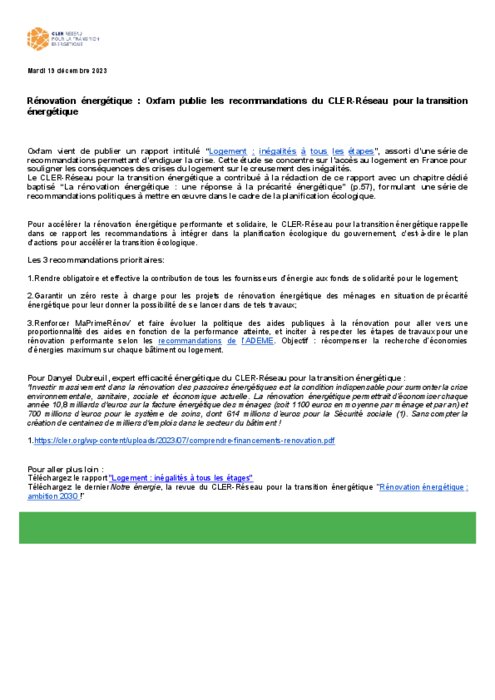 Oxfam vient de publier un rapport intitulé “Logement : inégalités à tous les étapes”, assorti d’une série de recommandations permettant d’endiguer la crise. Cette étude se concentre sur l’accès au logement en France pour souligner les conséquences des crises du logement sur le creusement des inégalités. Le CLER-Réseau pour la transition énergétique a contribué à la rédaction de ce rapport avec un chapitre dédié.