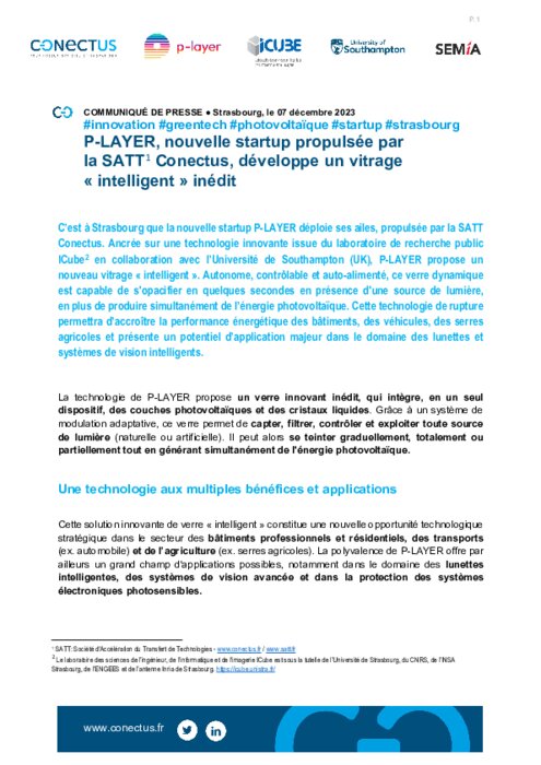 Ancrée sur une technologie innovante issue du laboratoire de recherche public ICube en collaboration avec l’Université de Southampton (UK), P-LAYER propose un nouveau vitrage « intelligent ». Autonome, contrôlable et auto-alimenté, ce verre dynamique est capable de s'opacifier en quelques secondes en présence d'une source de lumière en plus de produire simultanément de l’énergie photovoltaïque.