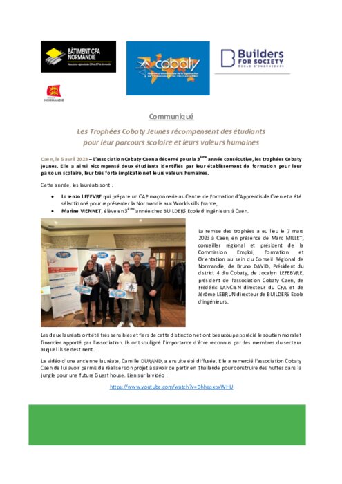 L’association Cobaty Caen a décerné pour la 3ème année consécutive, les trophées Cobaty jeunes. Elle a ainsi récompensé deux étudiants identifiés par leur établissement de formation pour leur parcours scolaire, leur très forte implication et leurs valeurs humaines.
