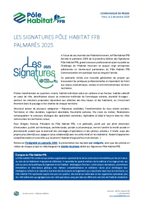 A l’issue de ses Journées de l’Habitat Innovant, le Pôle Habitat FFB dévoile le palmarès 2025 de la première édition des Signatures Pôle Habitat FFB, grand concours professionnel ayant succédé au Challenge de l’Habitat Innovant et auquel vingt entreprises adhérentes et trente-neuf partenaires du Pôle Habitat FFB Communication ont participé tout au long de l’année.