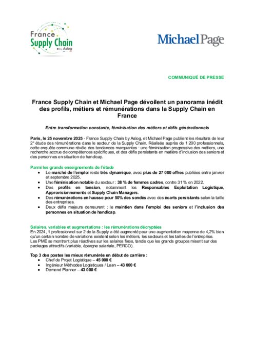 France Supply Chain by Aslog, et Michael Page publient les résultats de leur 2e étude des rémunérations dans le secteur de la Supply Chain. Réalisée auprès de 1 200 professionnels, cette enquête commune révèle des tendances marquantes : une féminisation progressive des métiers, une recherche accrue de compétences spécifiques, et des défis persistants en matière d’inclusion des seniors et des personnes en situation de handicap.