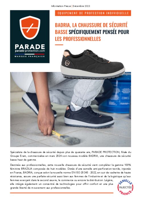Industriels 16 janvier 2024 - 10:43 Spécialiste de la chaussure de sécurité depuis plus de quarante ans, PARADE PROTECTION, filiale du Groupe Eram, commercialise en mars 2024 son nouveau modèle BADRIA, une chaussure de sécurité basse haut de gamme. PDF (298 Ko) Télécharger