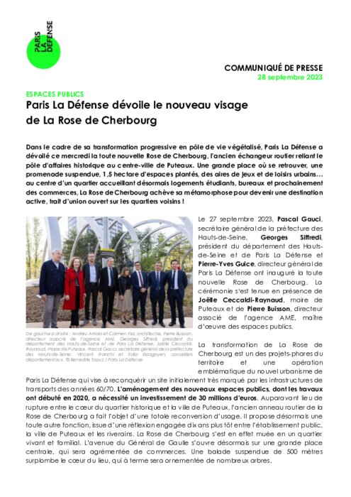 Dans le cadre de sa transformation progressive en pôle de vie végétalisé, Paris La Défense a dévoilé ce mercredi la toute nouvelle Rose de Cherbourg, l’ancien échangeur routier reliant le pôle d’affaires historique au centre-ville de Puteaux. Une grande place où se retrouver, une promenade suspendue, 1,5 hectare d’espaces plantés, des aires de jeux et de loisirs urbains…