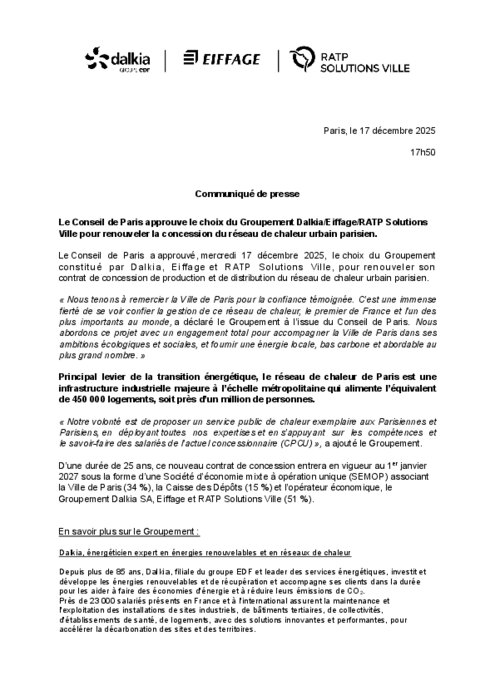 Paris valide la concession du réseau de chaleur au groupement Dalkia-Eiffage