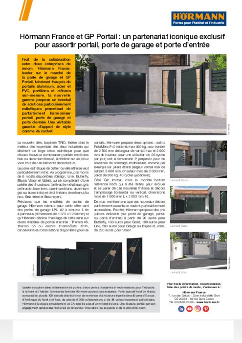 Fruit de la collaboration entre deux entreprises de renom, Hörmann France, leader sur le marché de la porte de garage et GP Portail, fabricant français de portails aluminium, acier et PVC, portillons et clôtures sur-mesure, la nouvelle gamme propose un éventail de solutions particulièrement esthétiques permettant de parfaitement harmoniser portail, porte de garage et porte d’entrée. Une véritable garantie d’apport de style comme de cachet.