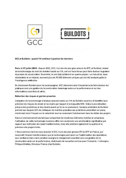 Depuis 2021, GCC, l’un des dix plus gros acteurs du BTP, et Buildots, leader de la technologie de suivi de chantier basée sur l’IA, ont uni leurs forces pour faire évoluer la gestion de projets de construction. Ensemble, ils ont déjà collaboré sur quatre projets : un industriel, deux résidentiels et un hôpital, couvrant plus de 70 000 éléments uniques qui ont été analysés grâce à l’intelligence artificielle.